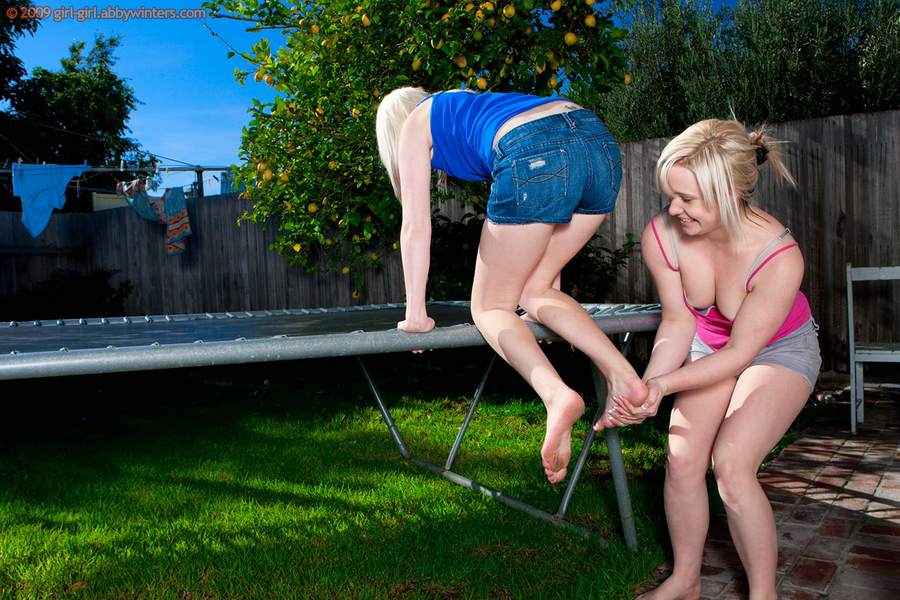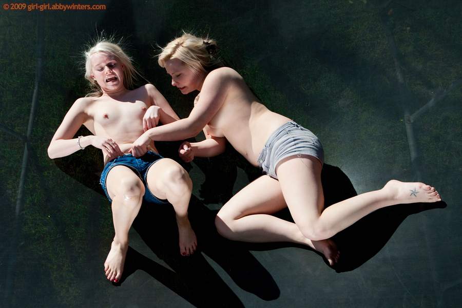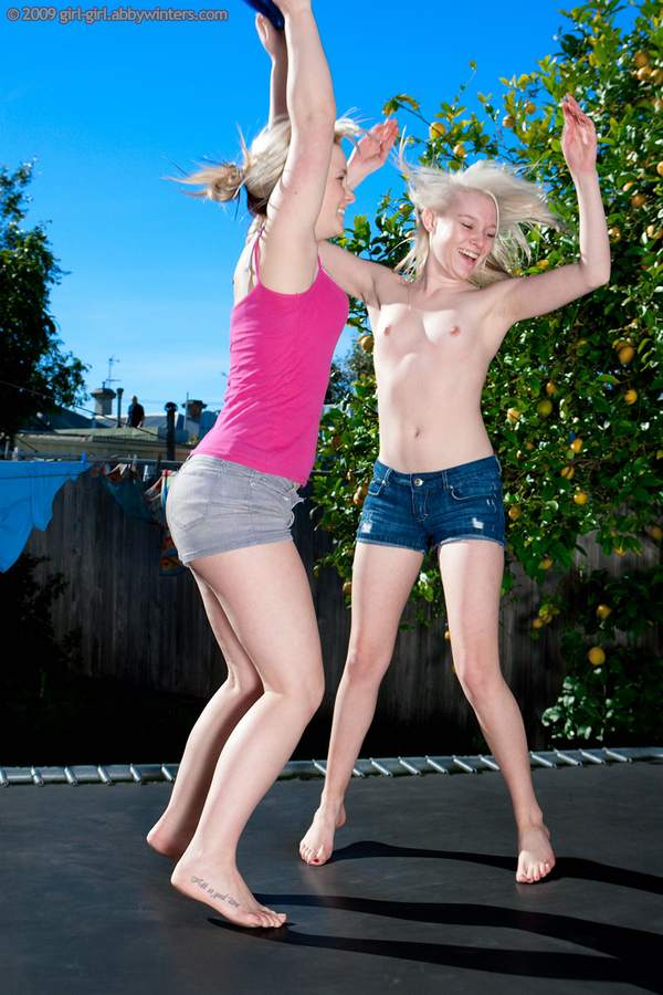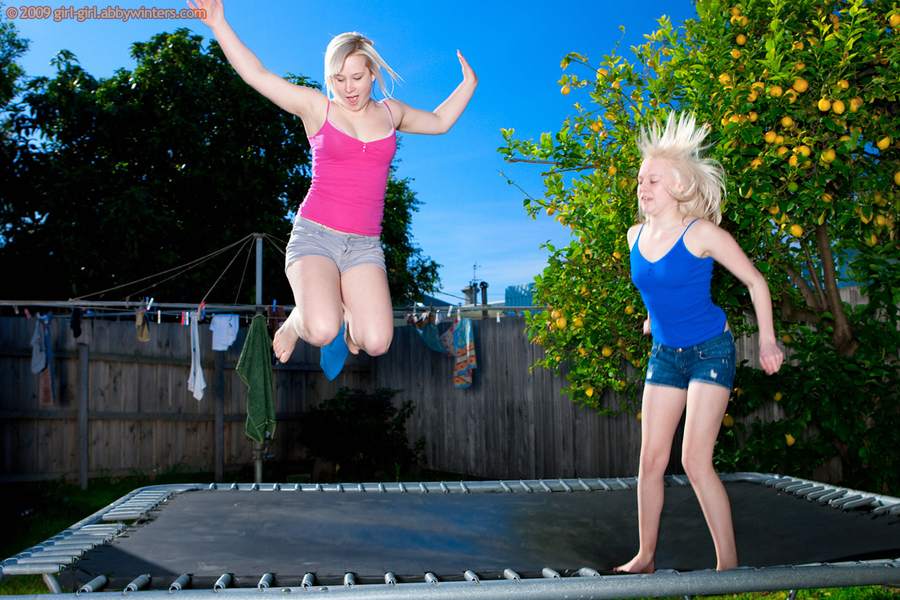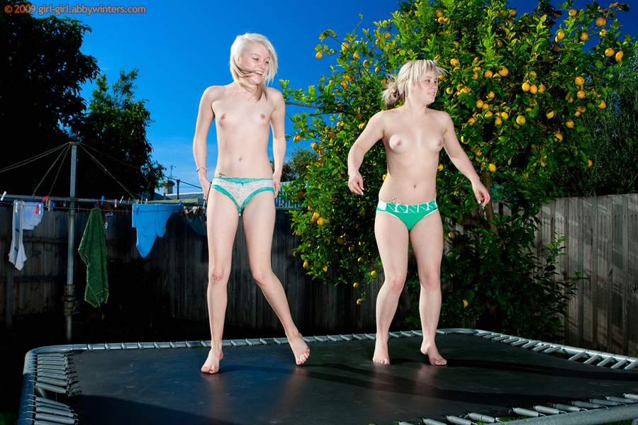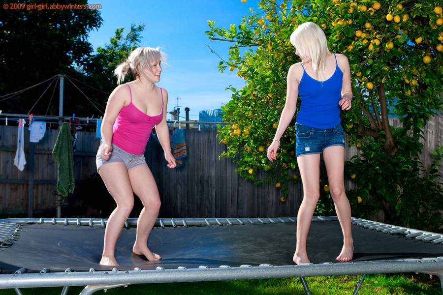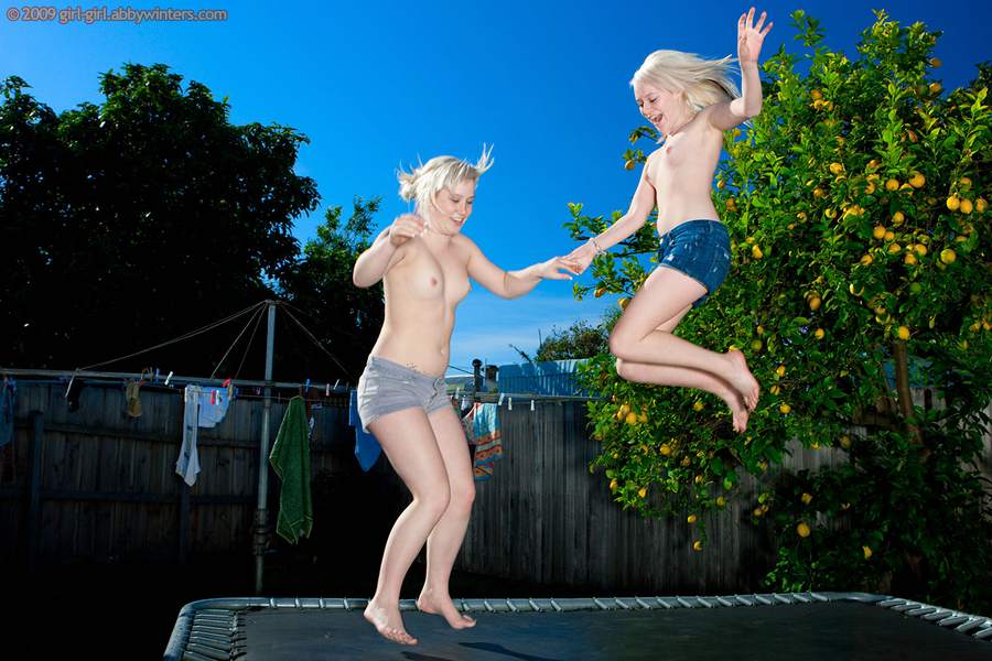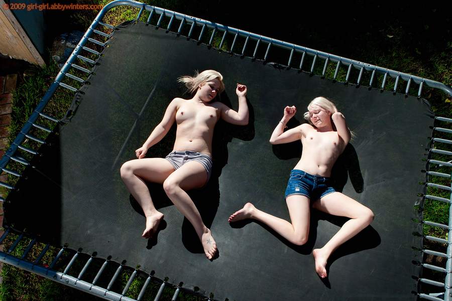 Abby Winters Joannie and Caitlin nude on the trampoline. They are not the sort of girls who shy from a bit of outdoor fun … or nudity! They’re keen to show us their agility and naturally sweet bodies as they shed their clothes and show us how it’s done on the trampoline of sexiness. This was fun. Joannie is always a joy on screen. Little Caitlin is a pretty newcomer and a helluva good bouncer.