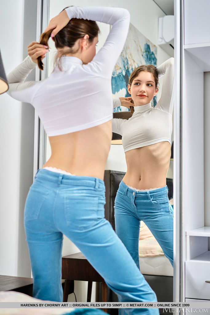 Cute new 18 year old model Hareniks wears a crop top and bun-hugging blue jeans, drawing attention to her slender waist. The sweet Ukrainian brunette is eager to show you more, wriggling out of her denims and tugging her white cotton panties aside to expose her lush-lipped pussy. She’s soon naked on the bed, her nipples stiff with arousal at the thought of your eyes on her lovely body for the first time.
